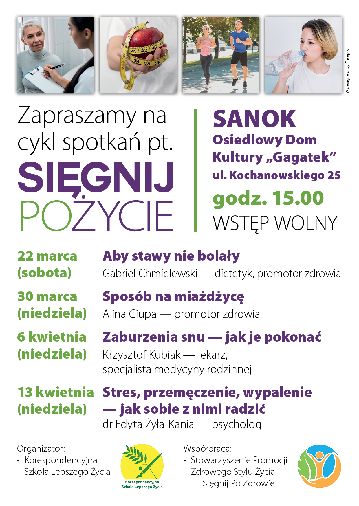 Serdecznie polecamy serię bezpłatych wykładów na temat stylu życia, m.in. chorób układu krążenia, stresu czy zdrowego snu. Organizatorem programu „Sięgnij po życie”, w ramach którego odbędą się powyższe wykłady, jest Korespondencyjna Szkoła Lepszego Życia przy współpracy ze Stowarzyszeniem Promocji Zdrowego Stylu Życia – Sięgnij Po Zdrowie.